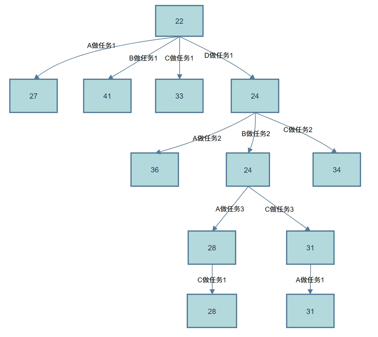 - 这么来看,如果 D 做任务 1,美好估计的值最小。我们说真实情况一定比美好估计要大于等于,也就是“D 做任务 1”有更大概率可以通向那个解。我们就从 D 开始往下搜,决定谁做任务 2
