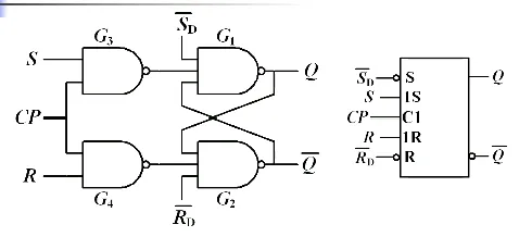 右边两个是一个基本 RS 触发器,左边两个是输入控制电路