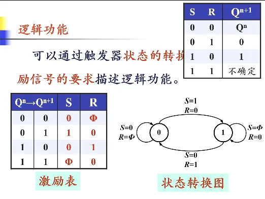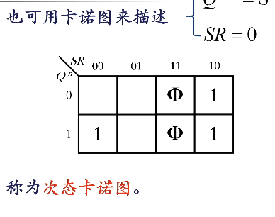 - 表达式(特性方程):,约束条件 (即 RS 不能同时为 1,否则进入无意义状态)。写表达式的方法就是真值表到表达式的方法,只要把 当作一个单独的符号即可
