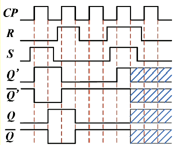 工作原理: 时,主触发器根据 S、R 的状态翻转,从触发器处于保持状态。CP 回到 0 时,主触发器处于保持状态,CP 经过反向器接到从触发器,此时从触发器被打开,并按照与主触发器的输出进行翻转。即 时候设定 S、R 的信号但不产生效果,直到 CP 下降沿时才按照设定的信号产生效果,这个效果的表达式与基本 RS 触发器是一致的,即把 的信号直接传过来