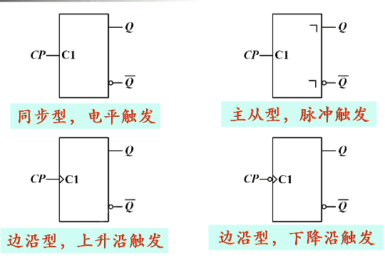 对于边沿触发器,CP 里面有一个小三角。如果 CP 外面没有圆圈,说明是上升沿触发;如果 CP 外面有圆圈,说明是下降沿触发