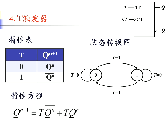 T 触发器:当触发器有效时, 时保持, 时翻转