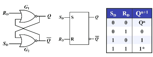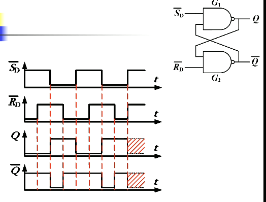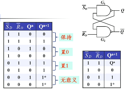 - 保持功能:,,由于两个都是低电平有效,此时两个都是无效的。此时状态保持住,数据记忆了。我们记触发器接收信号之前所处的状态称为初态,符号 ;接收信号之后建立的新状态叫做次态,符号 。次态不仅和输入信号有关,还和次态有关。