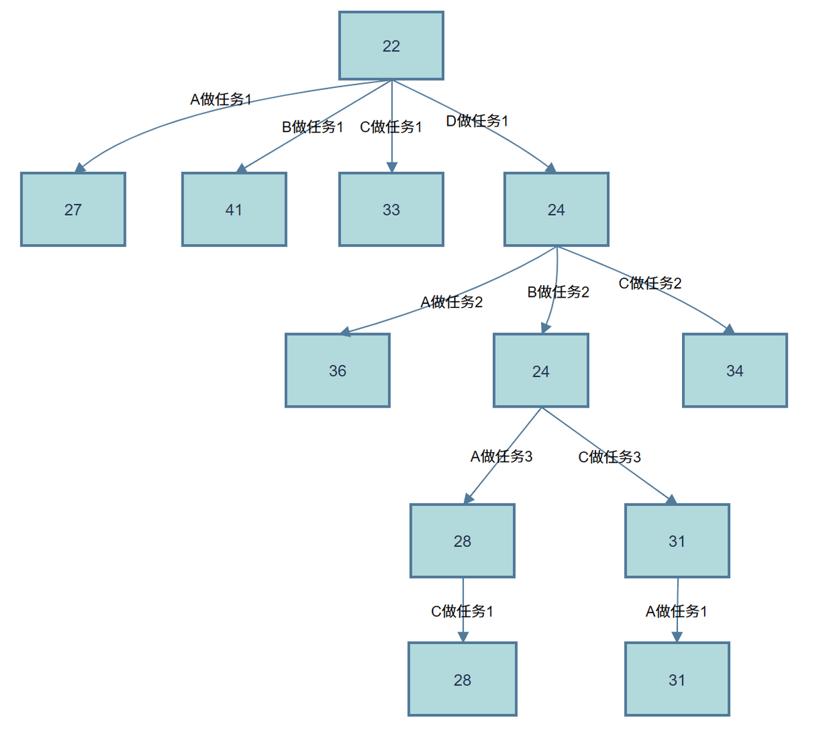 - 假设 A 做任务 1,那么 A 那一行和任务 1 那一列就被占掉了,那么已经定下来的时间就是 2,剩下 BCD 做任务 234,我们还是让最快的人做,即让 B 做任务 2、D 做任务 3、B 做任务 4,这样美好的估计就是