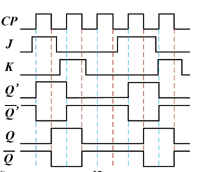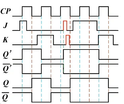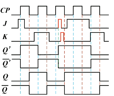 CP=1 时,主触发器根据 JK 状态而动作,从触发器处于保持状态;CP=0 时,从触发器根据主触发器的状态进行输出。对于 的输入组合,这些和之前都是一样的。