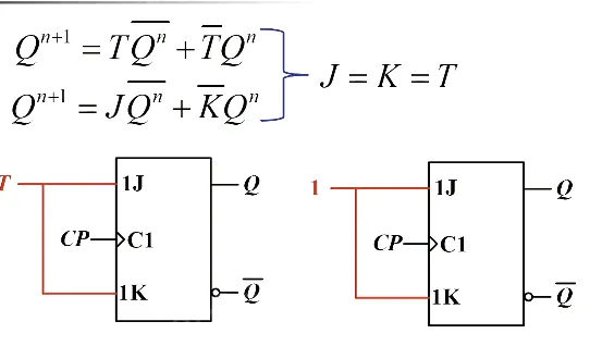 JK 触发器转 T 触发器(T’ 也可以,看右图)。