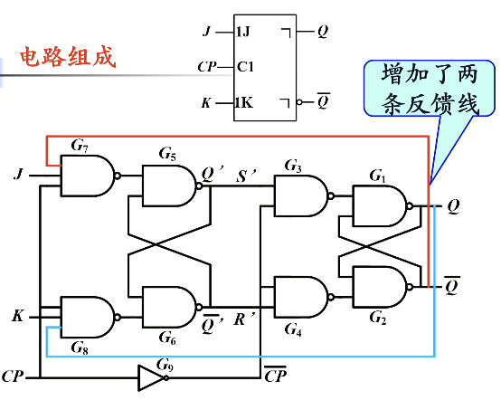上面说的功能,有一个基本前提:CP=1 时 J 与 K 不发生变化。如果 J、K 在 CP=1 时发生了变化,则不能直接根据 CP 下降沿前的 JK 状态判断 Q 的变化。因为 CP=1 时,主触发器的左侧两个门总会有一个是被封锁的,只能接受没被封锁的那个门的信号。见下图