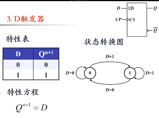 当 的时候,出现无意义状态,即当 CP 下降沿的时候电路变得随机。但不论怎么随机,要么 Q=0 要么 Q=1,分类讨论一下。发现当 的时候,推导完得 ;当 的时候,推导完得 。于是得出结论: