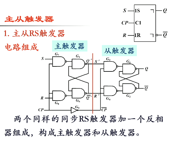 工作原理: 时,主触发器根据 S、R 的状态翻转,从触发器处于保持状态。CP 回到 0 时,主触发器处于保持状态,CP 经过反向器接到从触发器,此时从触发器被打开,并按照与主触发器的输出进行翻转。即 时候设定 S、R 的信号但不产生效果,直到 CP 下降沿时才按照设定的信号产生效果,这个效果的表达式与基本 RS 触发器是一致的,即把 的信号直接传过来